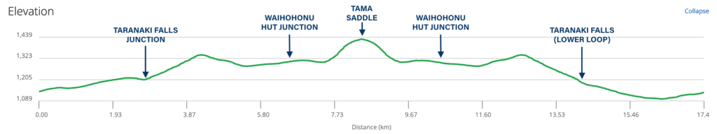 The Tama Lakes Track is a 17km / 10.5mi out-and-back (return) trip with approximately 480m / 1.574 ft of total ascent. It can roughly be divided into the following sections: